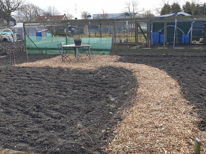 De voorbereidingen voor de kindertuin nummero 3. Dat wordt een bloemenpluktuin met een overdekte picknick tafel en een mooi slingerend pad van houtsnippers!