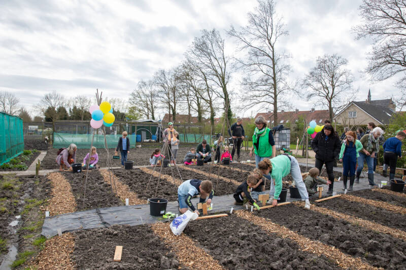 Enthousiast gaan de kinderen met harkjes en zaadjes in de weer. Mees Goedhart zit onder toeziend oog van zijn vader Aart lekker in de aarde te wroeten. Aart: ,,We hebben zelf ook een stukje met frambozen en ander klein goed in de tuin. Ik heb vroeger nog natuurles van Babs gehad, heel leuk dat ze dit doen. Het is belangrijk dat we dit nog hebben op het dorp.” Dat vindt bestuurslid van de volkstuinvereniging Johan Schepers ook. ,,We hadden een aantal opzeggingen en doen ons best om het toch in stand te houden. We bedachten om iets voor de kinderen te gaan doen. Op die manier raken ouders en grootouders misschien ook enthousiast voor de volkstuin. Bovendien willen we de kinderen achter hun schermpjes vandaan halen.”
